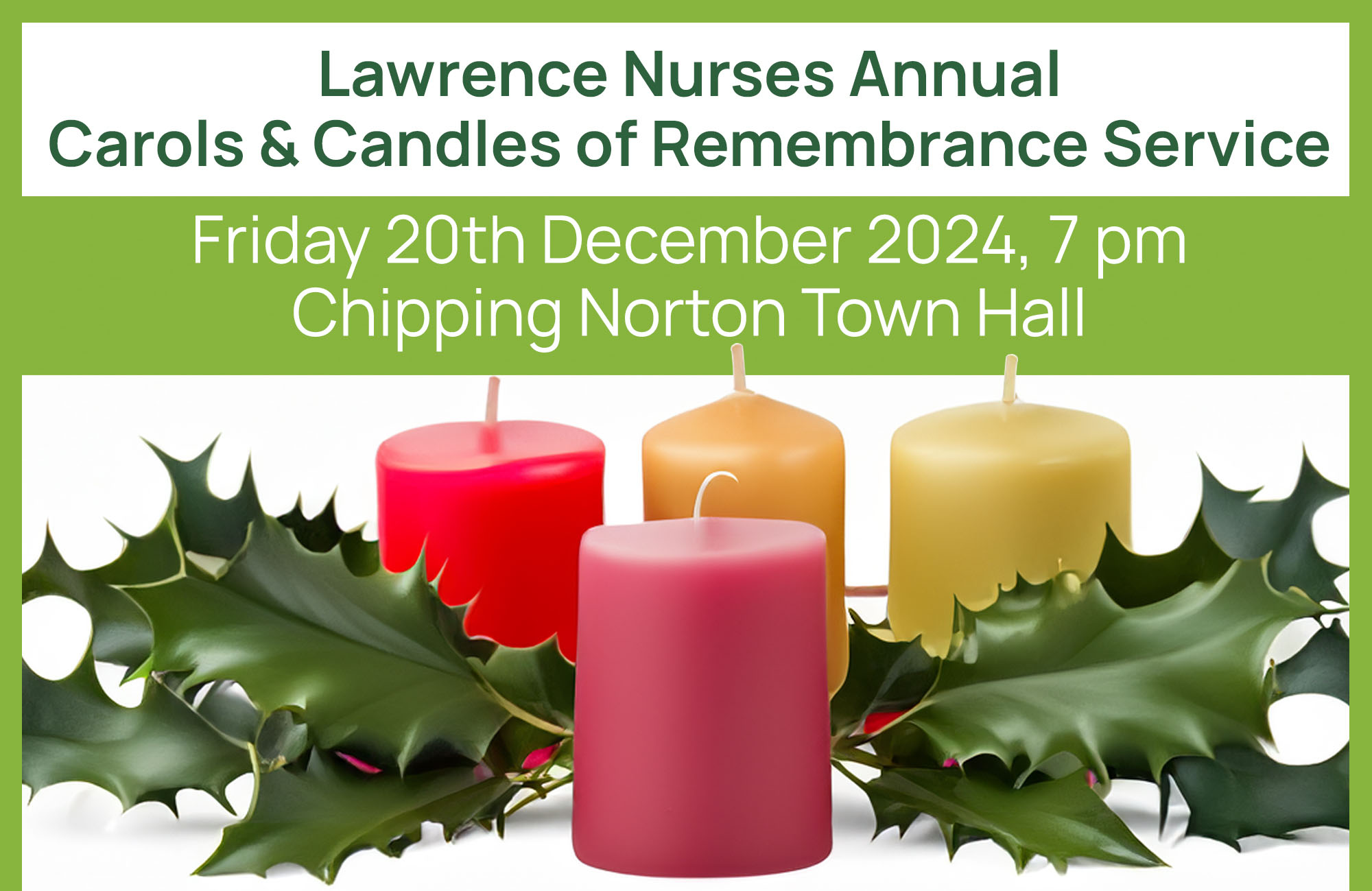 The Lawrence Nurses Annual Carols & Candles of Remembrance Service takes place at Chipping Norton Town Hall on Friday evening 20th December 2024 at 7 pm.